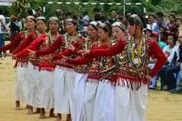 MIJI: The Miji, also known by the names of Sajolang and Damai, inhabit the districts of West Kameng, East Kameng and a minuscule region of KurungKumey in Arunachal Pradesh, India. Their population of 37,000 are found near the lower parts of the sub-Himalayan hills bordering Assam; they speak the Sajalong language. The traditional costume of Miji women consists of an ankle-length white garment with a beautifully decorated red jacket. Like the Akas, the Miji wear silver ornaments and glass-based necklaces. Indigenous cosmetics are made from pine resin. Most Miji are adherents of Animism, although a few have adopted Christianity. Like the Akas, the Mijis share religious affinities with the Donyi Polo faith and thus are considered adherents of Donyi Polo, although other gods are given higher veneration than Abotani. There is some Buddhist influence as a result of longstanding cultural contacts with Buddhist tribes to the west, and the celebration of Losar as well as the usage of prayer flags are some indicators of this.